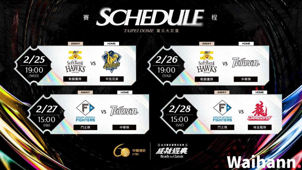 | 2/26 (四) | 19:00 | 福岡軟銀鷹 vs. 中華隊 |