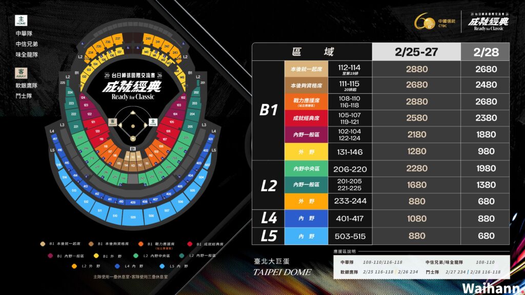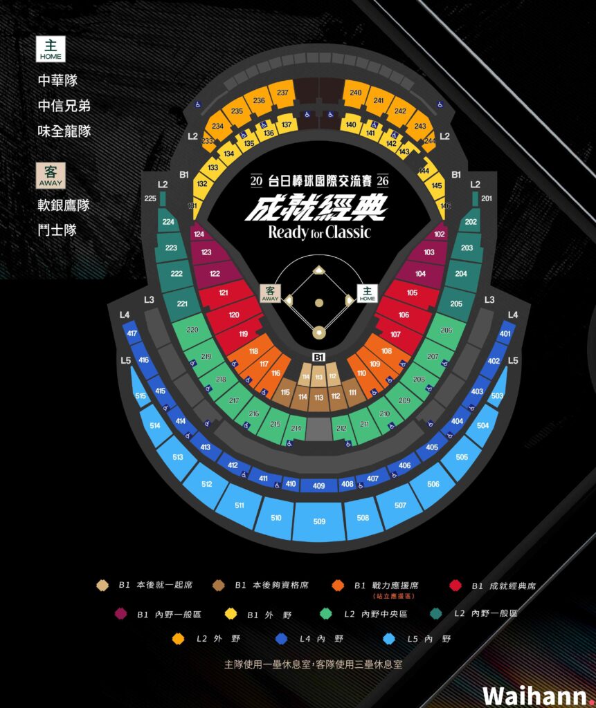 選位小秘訣: 台灣球隊(中華隊、中信兄弟、味全龍)休息區位於 一壘側;日本球隊(軟銀、火腿)位於 三壘側。想近距離看啦啦隊應援,記得搶 B1 應援席!